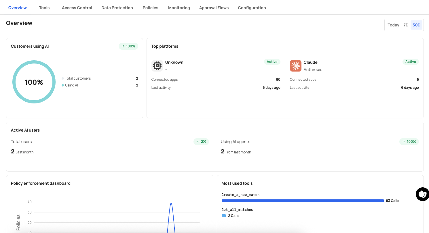 The Overview dashboard provides real-time analytics on how your SaaS product is being used through AI platforms and agents. It aggregates data across all tenants and tools, giving you a single view of AI adoption, user activity, policy enforcement, and tool usage.