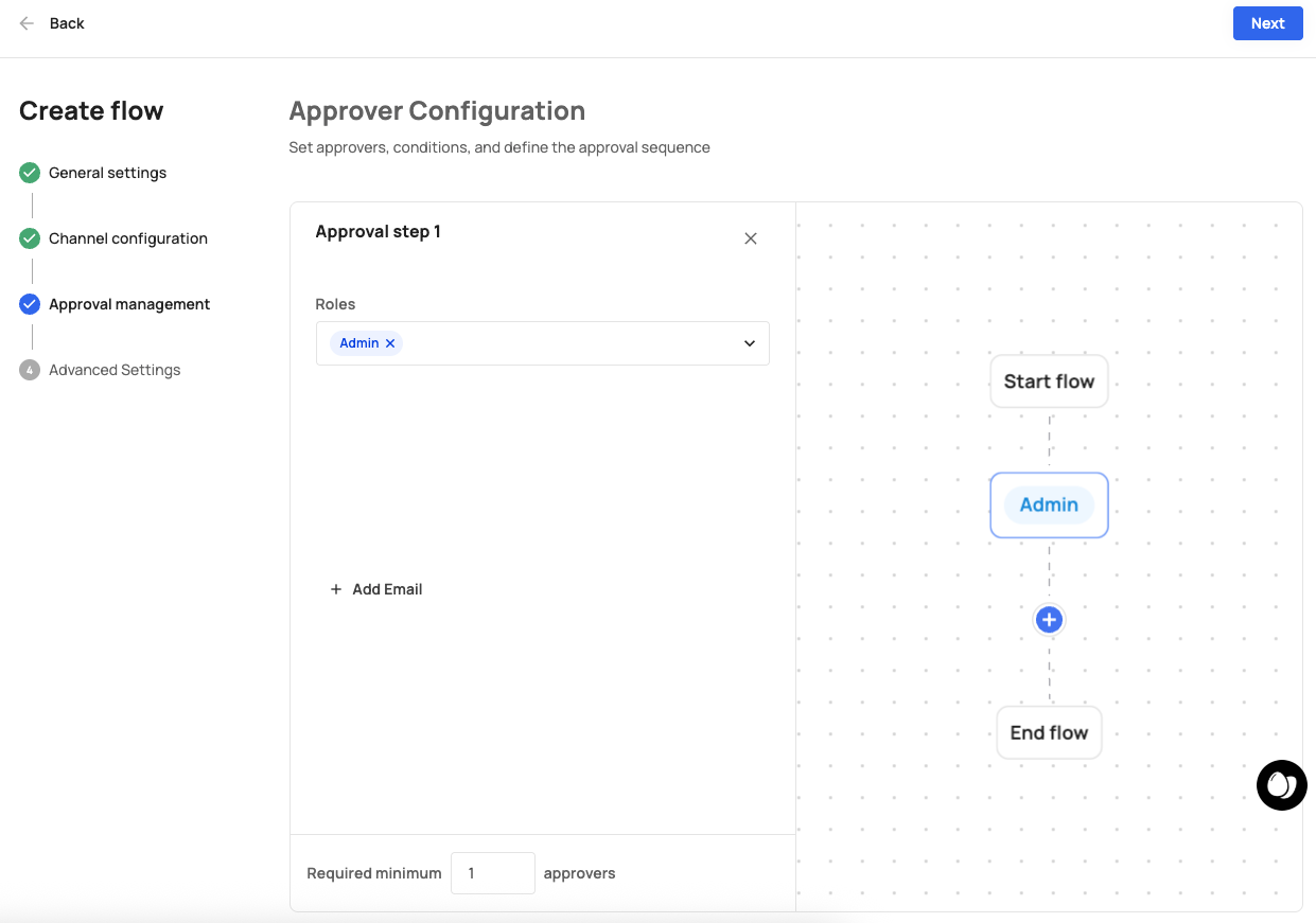Enable at least one channel to ensure approvers receive notifications. Click Next to proceed to Step 3.