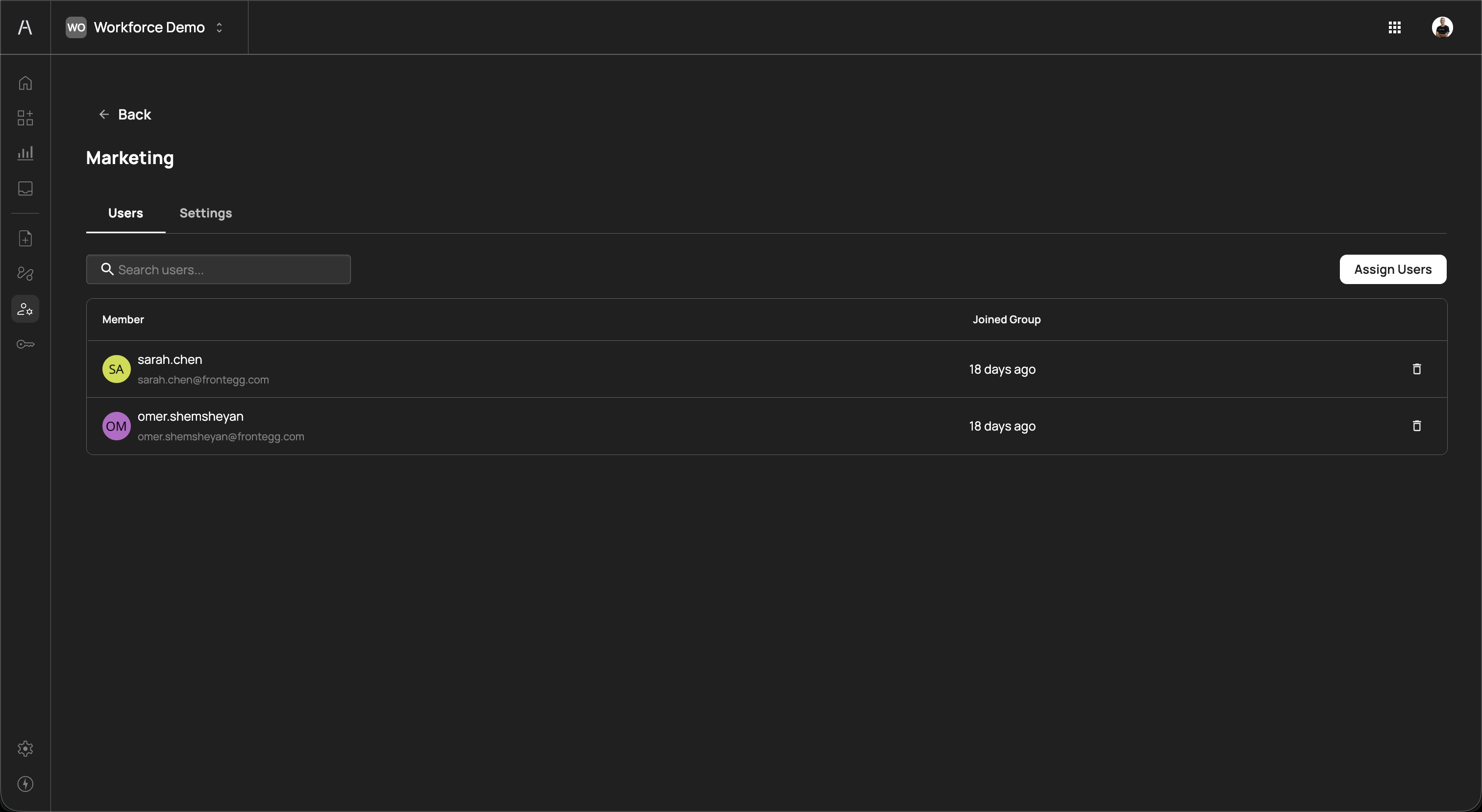 Click Assign Users in the top-right corner to add users to the group. A panel opens listing all available users. Select one or more users and confirm to assign them. Use the Search users field to find specific users.
