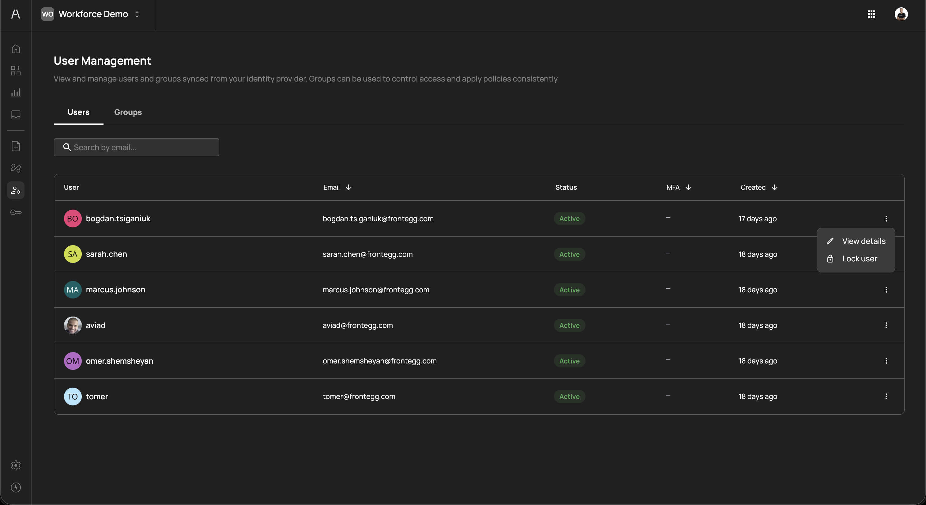 The User Management page is your central hub for viewing and managing the users and groups synced from your identity provider. Groups can be used to control access and apply policies consistently across teams, ensuring that AI agent permissions stay aligned with your organization's structure.