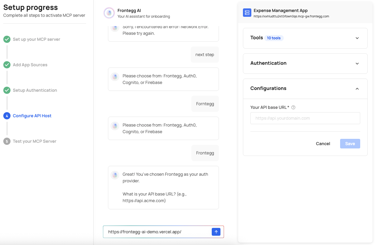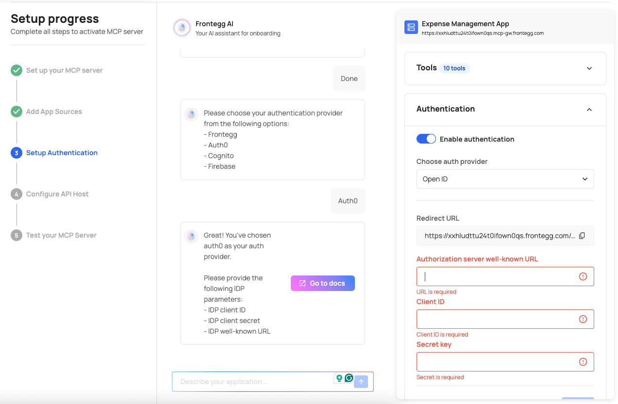 In just a few minutes, you'll complete a five-step onboarding flow that sets up your MCP server, imports your API tools, configures authentication, and connects your application to AI platforms and agents.