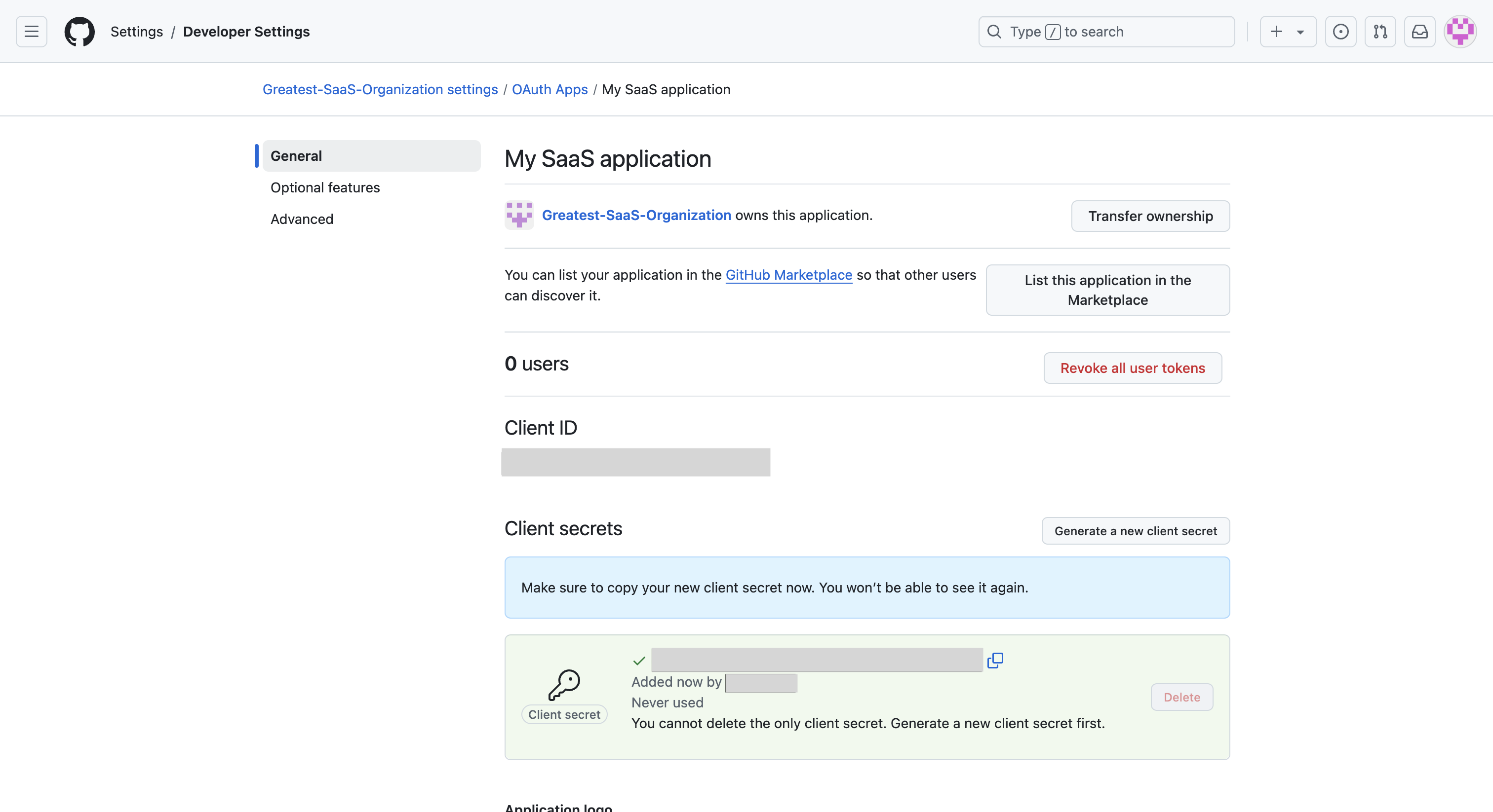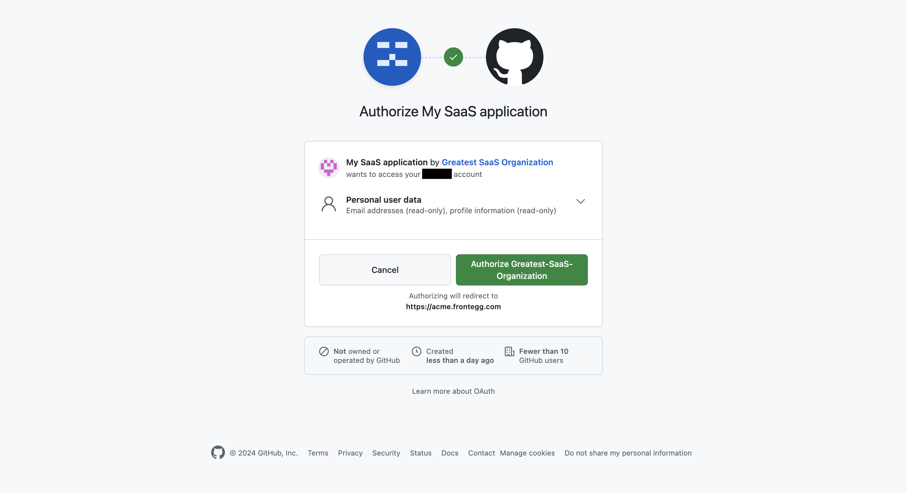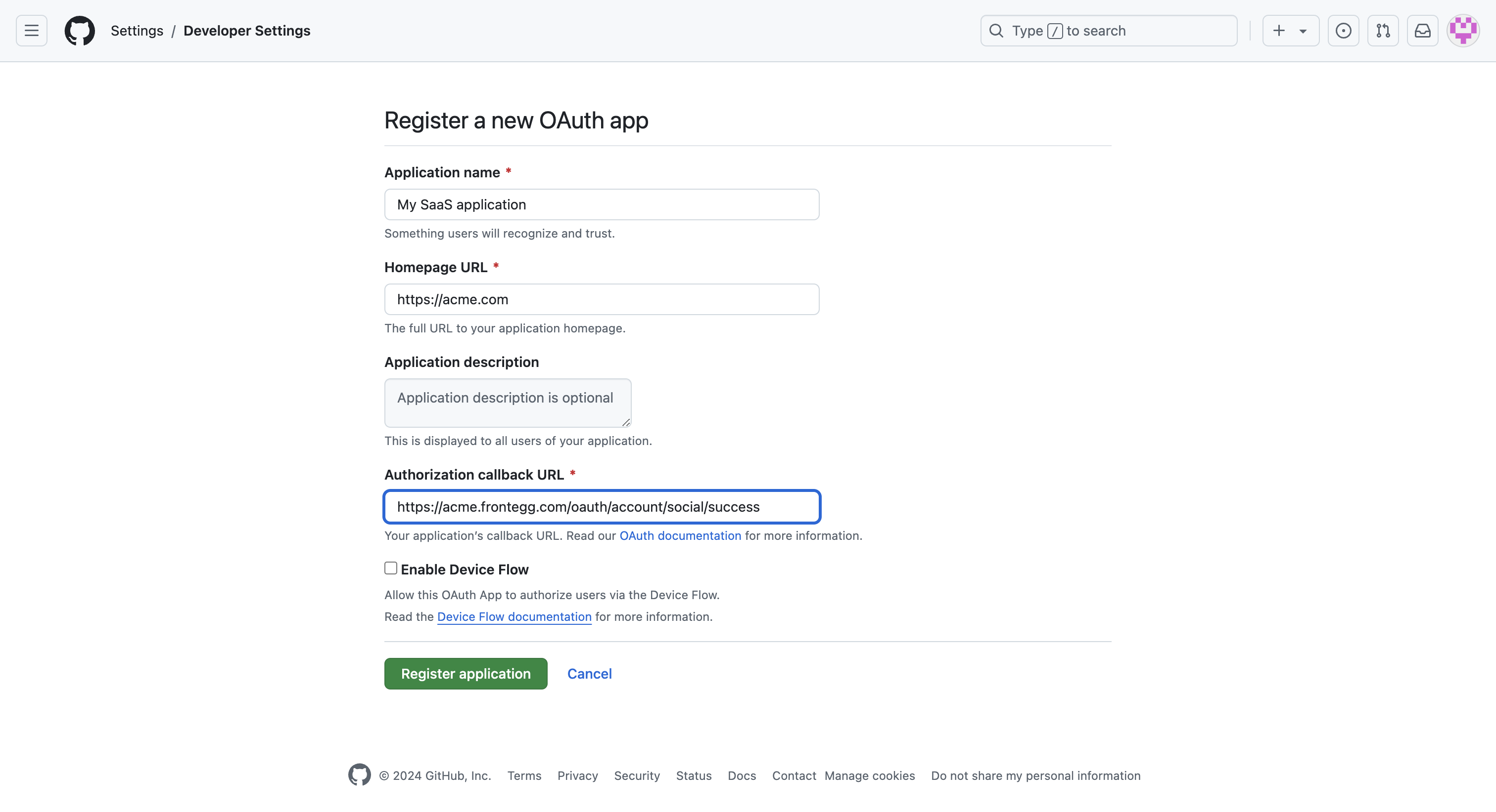 - Click New OAuth App and fill in the application name and details. For the callback URL, enter your application URL (use your Frontegg domain if using hosted login or your app domain if using embedded login), followed by