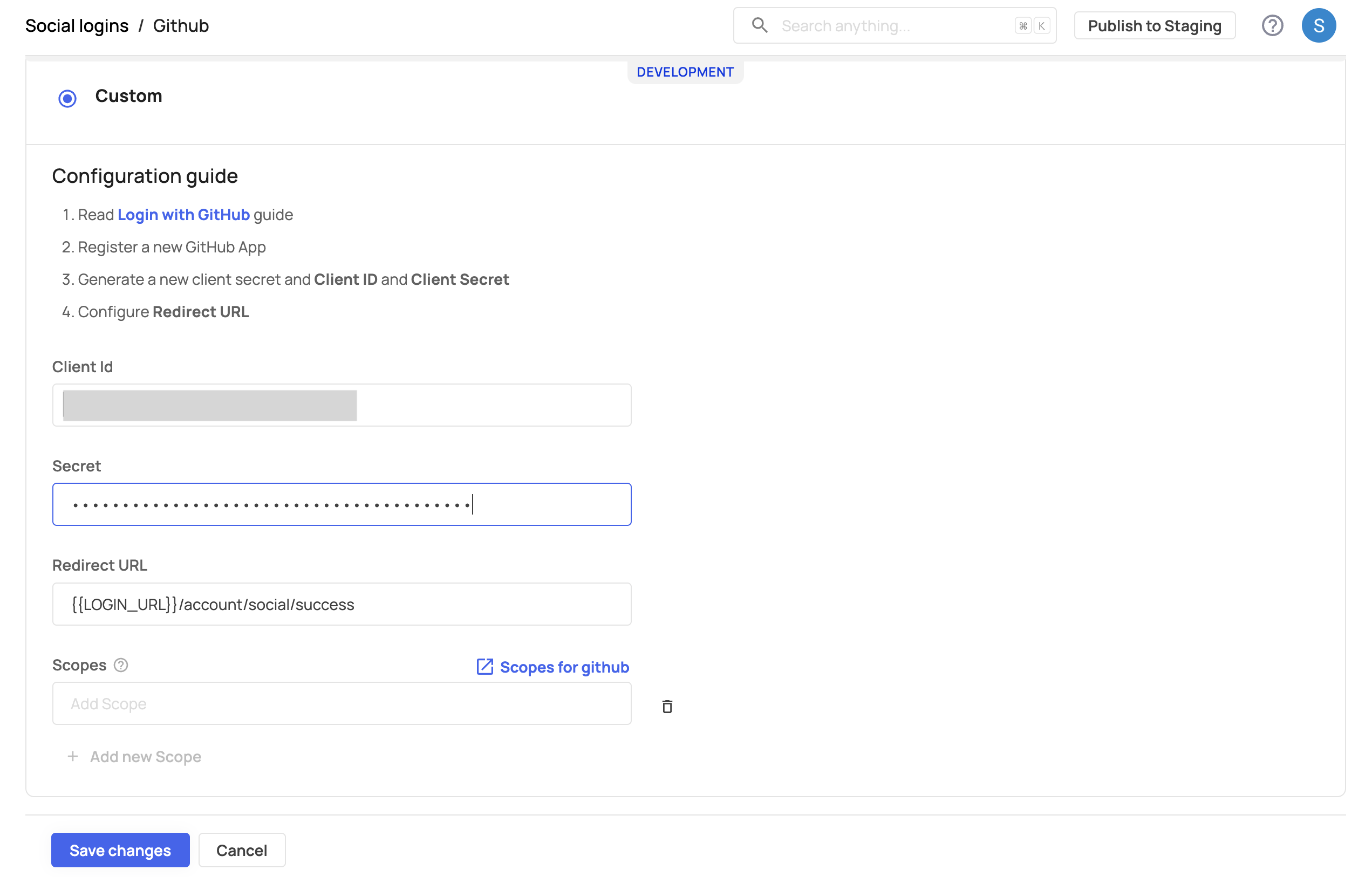 - Enter your GitHub Client ID, Client Secret, and Redirect URL, then save and publish.