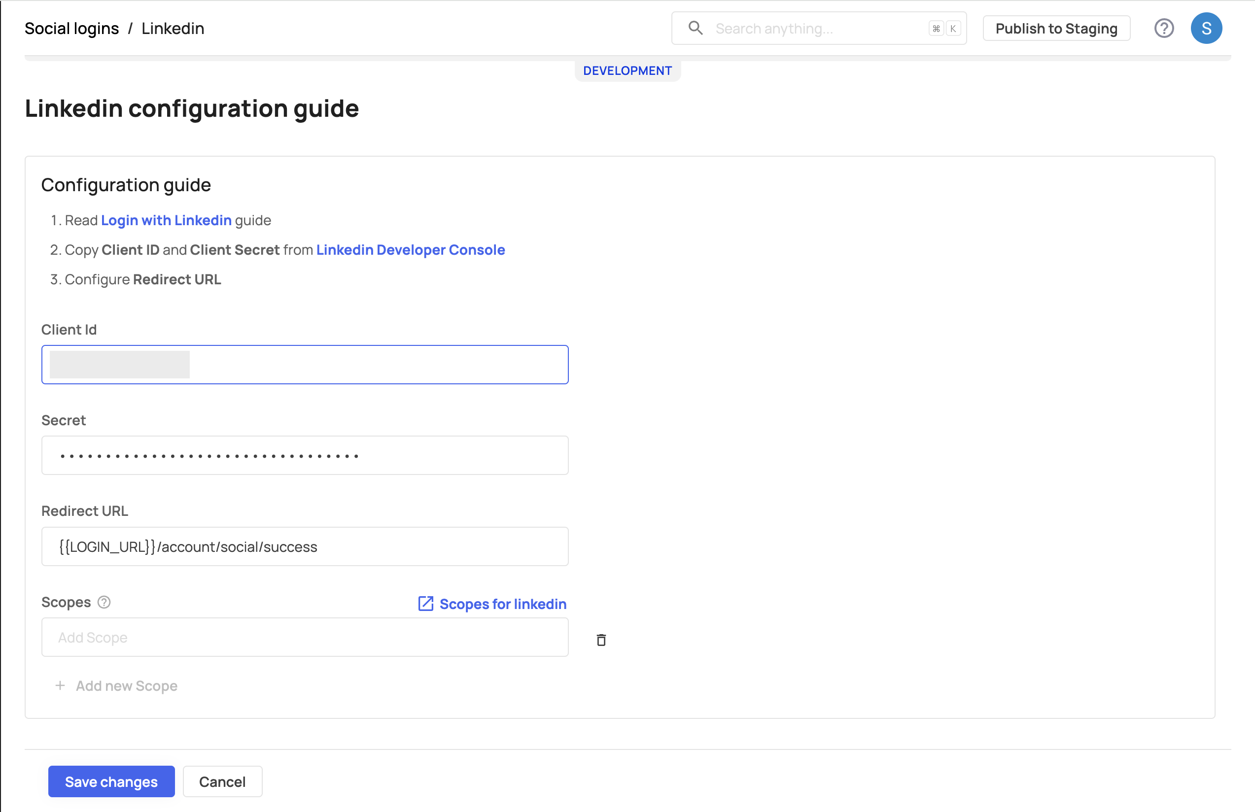 - Navigate to [ENVIRONMENT] ➜ Configurations ➜ Authentication ➜ Social logins and select Manage on the LinkedIn card.