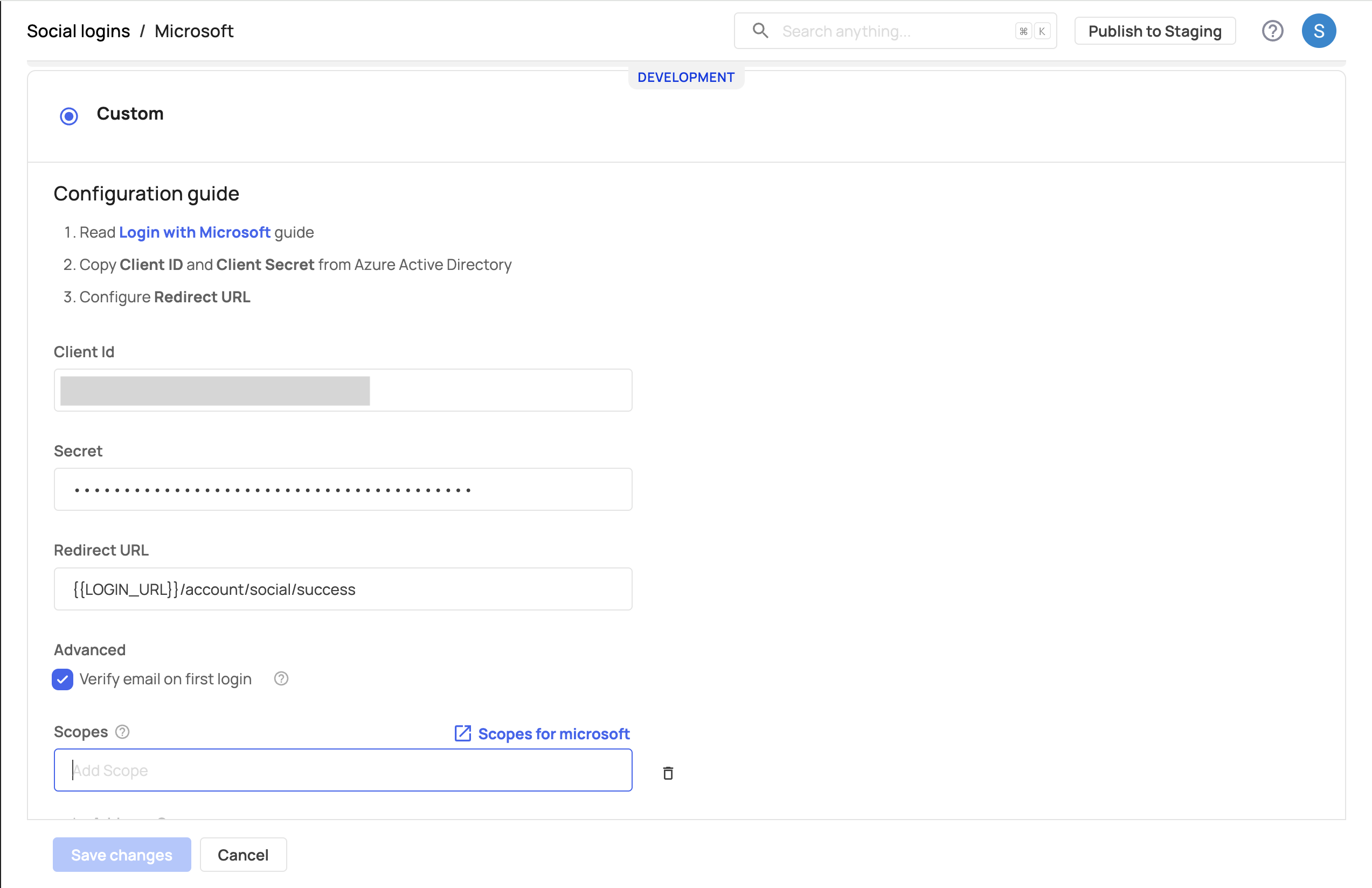 To add additional custom scopes, go to [ENVIRONMENT] → Configurations ➜ Authentication → Social logins → Custom → Scopes on the Frontegg portal. You can check Microsoft’s supported scopes here.