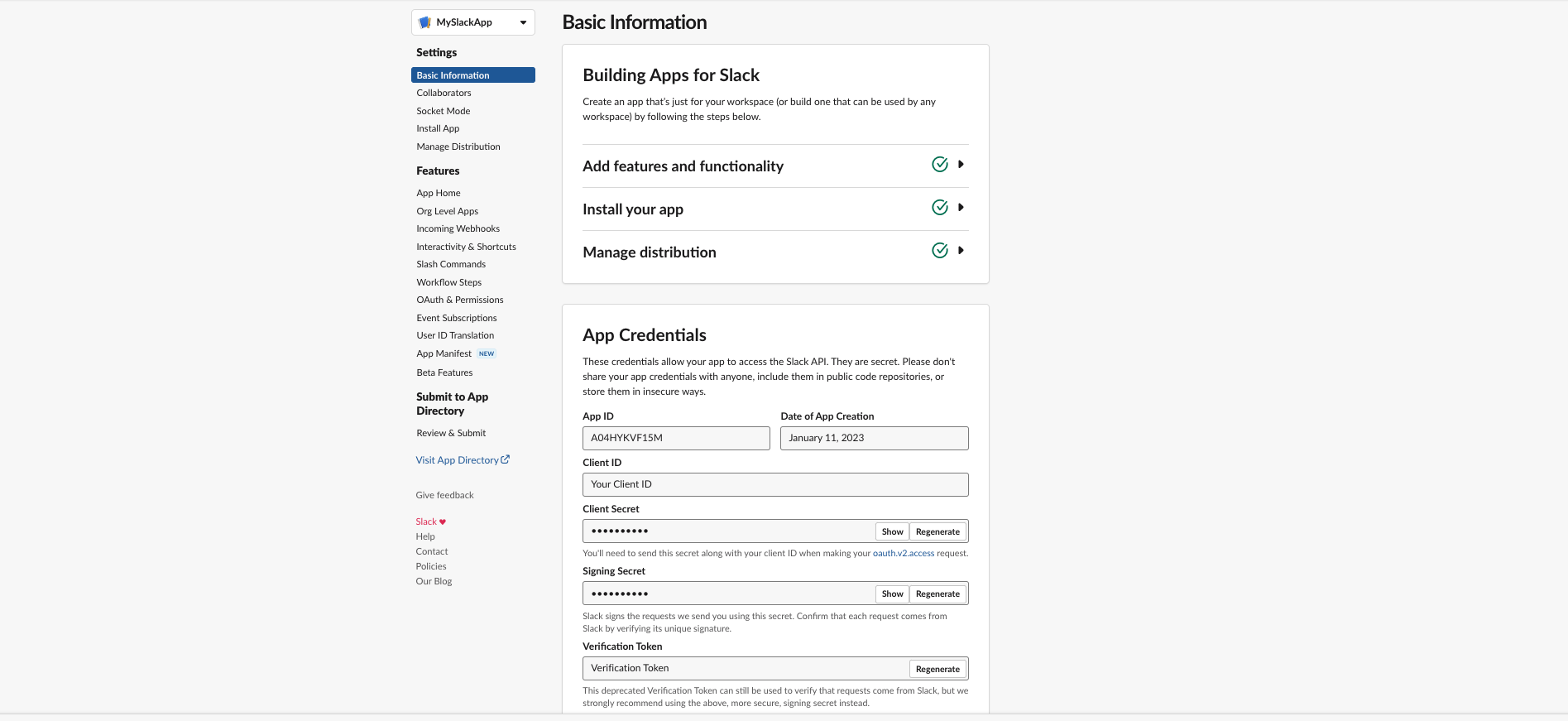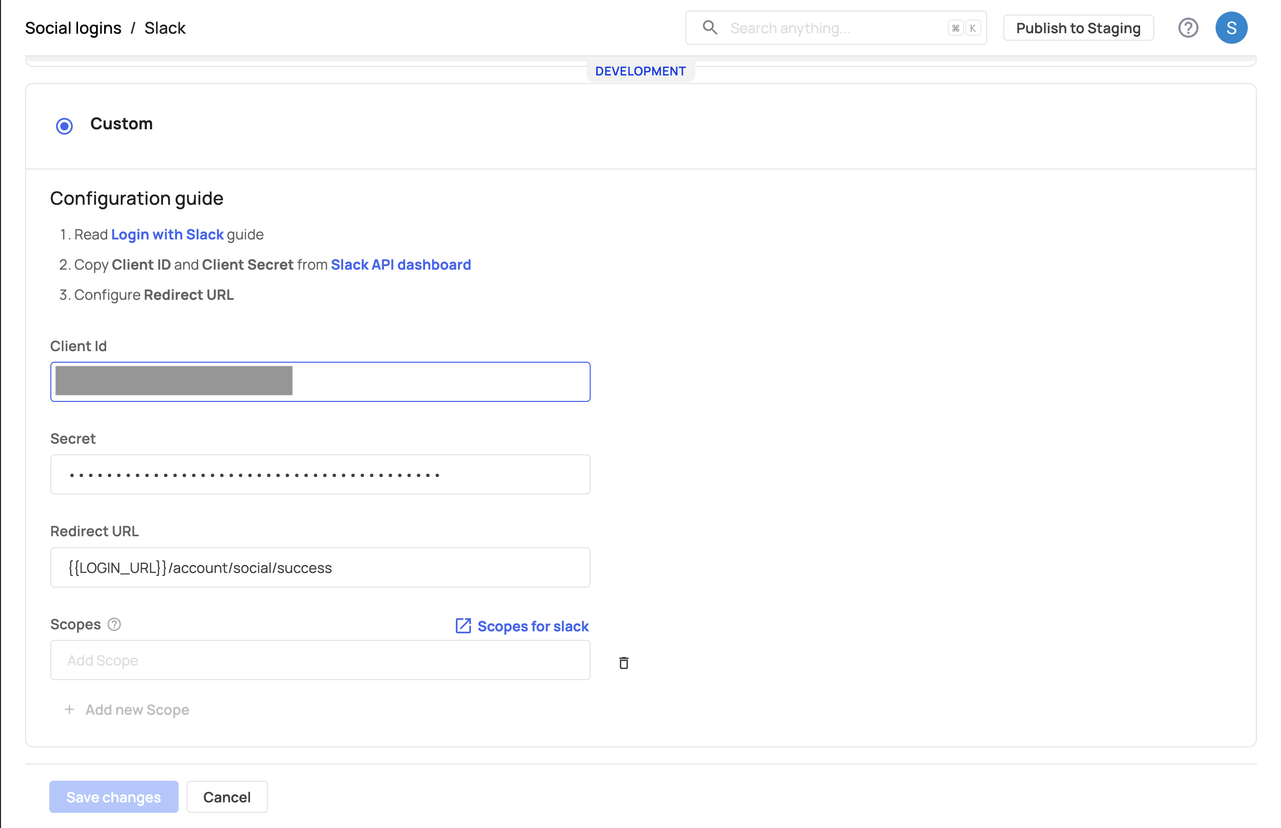 - Choose Custom, and enter the Client ID and Client Secret from your Slack app.