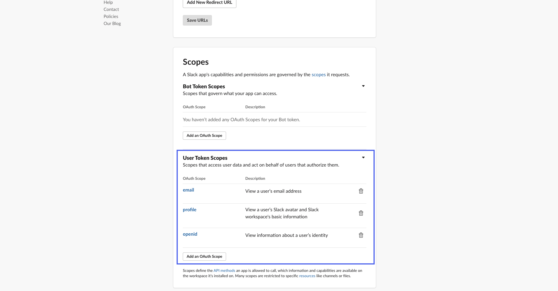 - For reference on supported scopes, see Slack's supported scopes documentation.